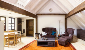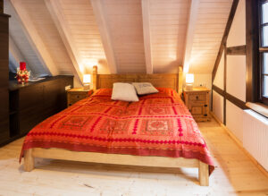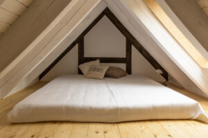 Auf 55 qm finden zwei Personen Platz. Die Ferienwohnung verfügt über einen großen Wohnbereich, eine offene Küche und ein offenes Schlafzimmer mit Doppelbett sowie ein Bad mit Dusche, Badewanne und WC. Eine zusätzliche Schlafmöglichkeit für zwei weitere Personen befindet sich auf der Galerieebene unter dem Dach. TV und WLAN sind selbstverständlich vorhanden.